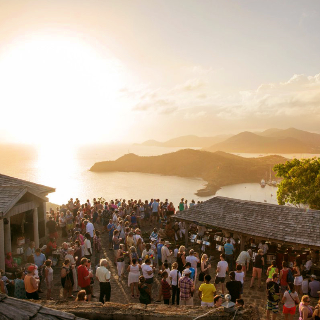 High above English Harbour sits Shirley Heights, Antigua’s most iconic viewpoint. The restored military fort offers panoramic views over both harbours and is famous for its weekly sunset gatherings with live music, local food, and a laid back island atmosphere.